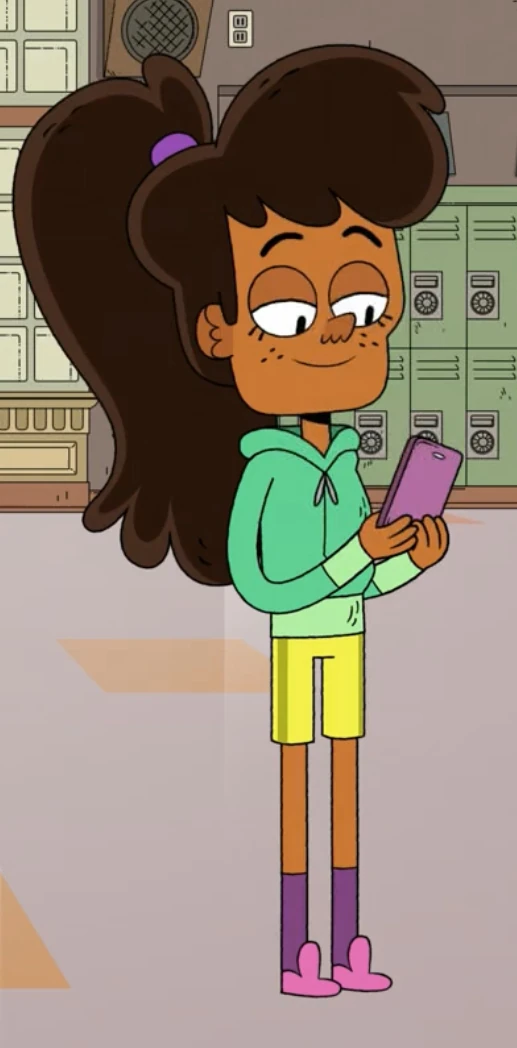 She is medium height. She has leg-length dark brown hair tied into a large high ponytail and freckles. She wears a green hoodie sweather, yellow shorts, purple socks and pink shoes.