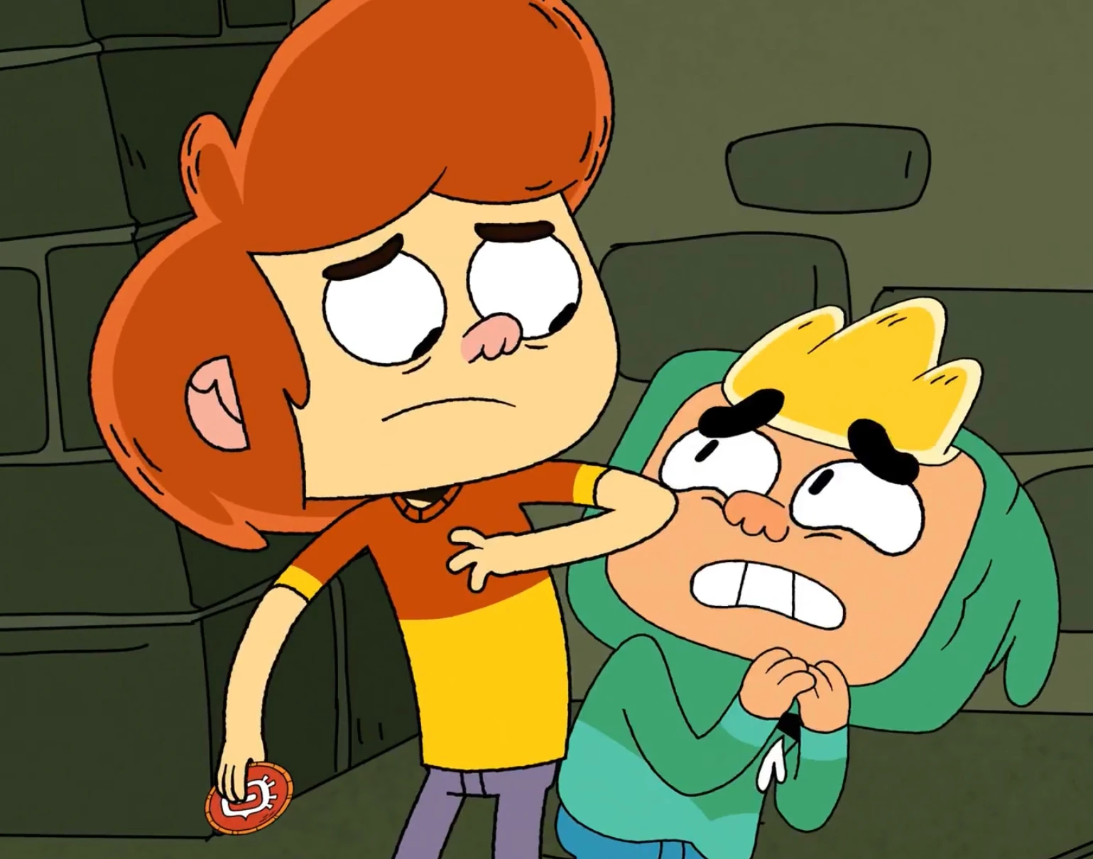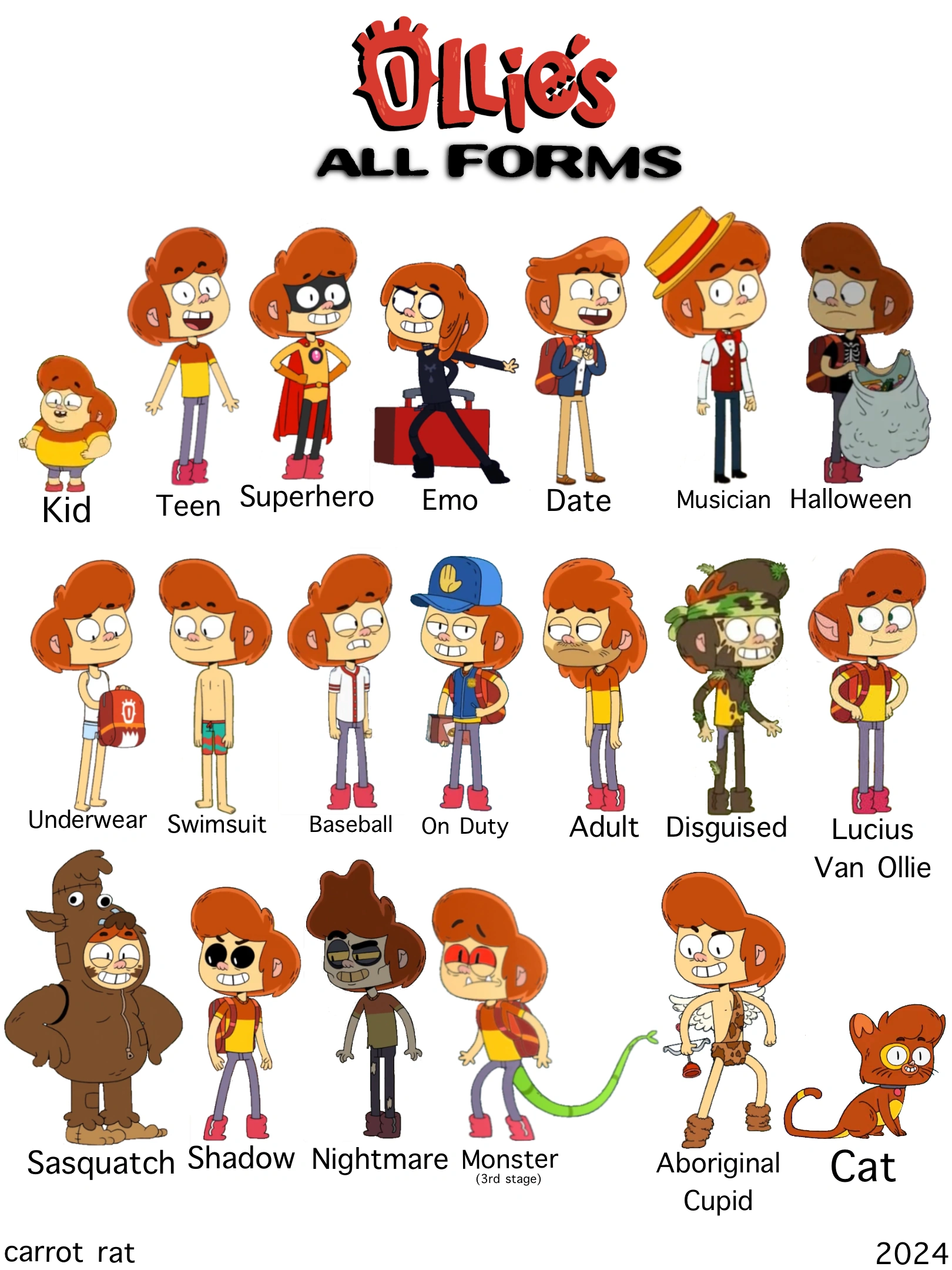 Oliver Allen (Ollie for friends) is the thirteen-year-old protagonist of Ollie's Pack voiced by James Hartnett, based on Morty from Monster Pack. He is Pyper Allen's older brother and son of June Allen and Mr. Allen, whose real name was never announced. He is the Keeper of the Pack, i.e Chosen One — he must to protect Earth from monsters, who make their way to our planet through portal. AppearanceOllie is a teen boy of medium height and slim build. He has bushy fiery orange hair and light skin. He has a gap in his teeth. He wears an orange-and-yellow T-shirt, gray-purple jeans and crimson boots. He carries the Monster Pack. It is also unknown about his eye color[2]. Personality!This paragraph contains spoilers! Official description"He’s an ordinary, impulsive and creative kid." — TV guide says. Description according to the epsSelfishnessApparently, Ollie has signs of narcissist syndrome. Sometimes he can be selfish, concerned only with himself and his feelings. However, even despite this, he values his friends and would not trade them for anything, as we can see in The Chosening where he took a risk and regained his status of the Chosen One in order to save Bernie and CW who were trapped on Andre and Bev’s ship and in Cube is the Loneliest Number where Ollie, having broken the rule on purpose, ended up with the Dark Cube so that he could help Ollie to save his friends from the vain bounty hunter, Ashlor. JusticeIn the end of The Janitor, he behaved fairly. His theories were true - the school's new janitor turned out to be a monster. But Ollie stuffed him into his Backpack without any proof, even before he knew the truth. As a result, he may have realized his guilt and honestly completed the task that Horbladge gave him and his friends. ImpulsivitySometimes Ollie does rash and stupid things, which contributes to the development of the plot. Riskiness and Decisiveness Bernie hides behind Ollie In the final episode, realizing the danger of the situation (when they were stumped by monsters), he behaved calmly and didn’t panic, unlike Bernie. Although he is not the smartest, he is decisive and collected in such situations. Relationships ”I do want everyone to like me — you most of all!” Ollie has a prolonged crush on Ivy as revealed in Crush it Ollie, when he wants to impress her so much so that he almost destroys the school thanks to the Fungus Monster. But in Separation Anxiety, he admits that he wants to impress Cleo too, and that’s the reason why he’s so irresistible around her (according to him). He is close friends with Cleo and Bernie. Apparently, Ollie has a longer relationship with Cleo than with Bernie, this can be understood from the Yard Sale Fail episode where he and Cleo were remembering their childhood with their old toys — horsey cops. He’s in good relationships with CW — his mentor and friend. Ashlor was in love with him. She repeatedly told him “I love you” and called him a “cutie-patootie” in the Part One, sending him an air kiss afterward. Design and Development Pedro Eboli’s drawing Depiction in the seriesNew Kid on CampusOllie woke up forcefully at the ringing of the alarm clock, clearly not wanting to get up. But he had to. His mentor asks Ollie to go to school with him, and he agrees. In the school, CW insults Magna, which causes Ollie some problems. The next day the boy decides not to take his friend to school, but he comes himself, eventually causing envy by stealing Ollie’s “social thunder” when CW plays with his classmates. Eventually, the envy leads to a Ball-Wall competition to prove who is better. Ollie naturally wins, and is about to take the final shot, but comes to his senses, saying he can't do it. SkillsWeaponsDone WeaponsIt is shown that, both in Major Snooch and in The Chosening, he doesn’t know how to use weapons at all. He never even tried. In Major Snooch, he begins to train, without special weapons, not out of his own interest, but because his coach forced him to. Ollie tries to shoot a cardboard monster with a slingshot Ollie tries to catch the monster with laser gloves Ollie threw the Net on Cleo🌷 He's such a genius that he's trapped himself Monster WeaponsKnows how to use Hydra (named by fans for its appearance) - a snake-like monster with three heads that can cling to objects with its teeth. Ollie’s preparing to throw Hydra In The Chosening he learned to use the Parachute - a jellyfish-like monster that can be summoned by pulling the ring under the left strap of the Backpack. LanguagesThere are 7 monster languages in total. Ollie doesn't know any of them. Ollie reads a book Monster-taming skillsThere are not so many scenes with taming - just one. Ollie was able to tame Fuzzy, thanks to CW’s advice. He and Cleo are sitting on big doggie However, there are his merits here too: he figured out what he needed to do so that he and his friends would not be eaten by a big dogtopus. Monster-capturing skillsHe is fast and agile, which helps him dodge and run away from monsters. He catches them with the help of his pals. As shown in Major Snooch, Ollie is much better at catching monsters without any weapons (obviously why). AbilitiesIn Not Another Superhero Movie, he can fly, but only under the influence of the Classic Superhero Orb Monster. Forms There are around 20 Ollie’s forms and costumes that are shown.