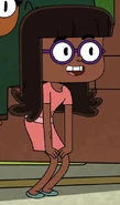 She is medium height and very skinny and wears a purple-rimmed glasses, has long waist-length dark brown hair with large bangs, and medium-brown skin. She also wears a pink dress and light blue flats.