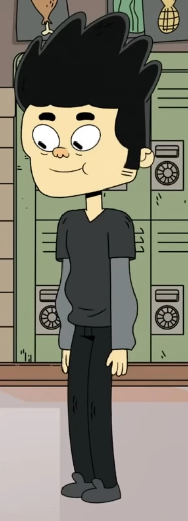 He is a tall, skinny boy with spiky black hair. He wears black shirt, pants and shoes, and gray long-sleeved shirt underneath.